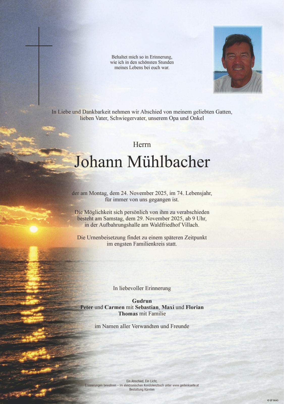Verschicken Sie eine private Nachricht an die Familie & Hinterbliebenen von Johann Mühlbacher. Diese wird nicht veröffentlicht, sondern landet direkt im E-Mail-Postfach der Administrator:innen dieser persönlichen Gedenkseite.