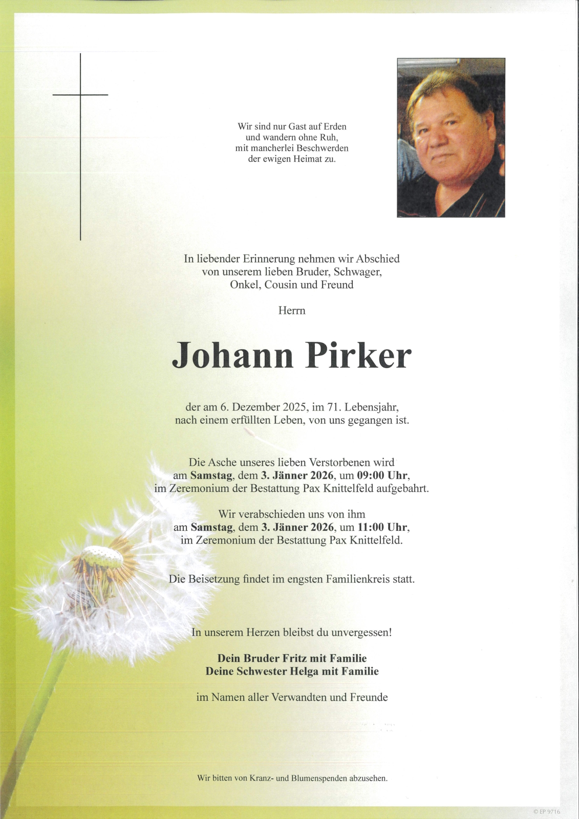 Verschicken Sie eine private Nachricht an die Familie & Hinterbliebenen von Johann Pirker. Diese wird nicht veröffentlicht, sondern landet direkt im E-Mail-Postfach der Administrator:innen dieser persönlichen Gedenkseite.