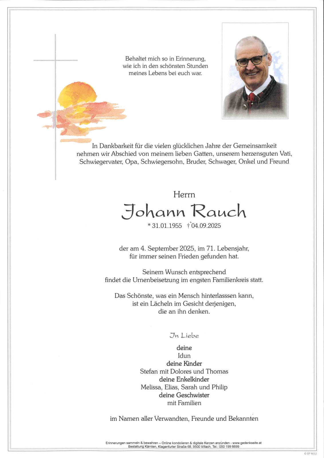 Verschicken Sie eine private Nachricht an die Familie & Hinterbliebenen von Johann Rauch. Diese wird nicht veröffentlicht, sondern landet direkt im E-Mail-Postfach der Administrator:innen dieser persönlichen Gedenkseite.