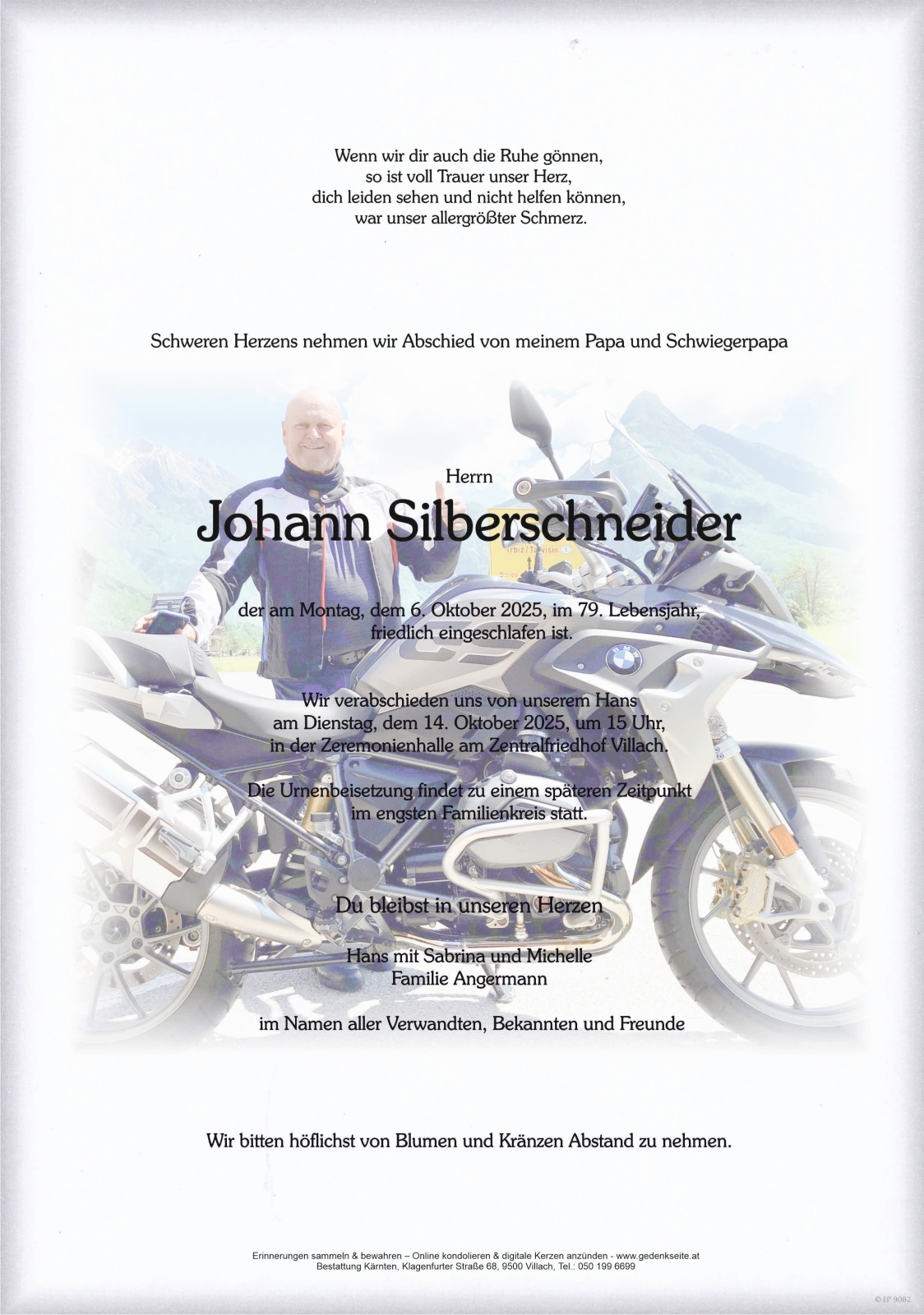 Verschicken Sie eine private Nachricht an die Familie & Hinterbliebenen von Johann Silberschneider. Diese wird nicht veröffentlicht, sondern landet direkt im E-Mail-Postfach der Administrator:innen dieser persönlichen Gedenkseite.