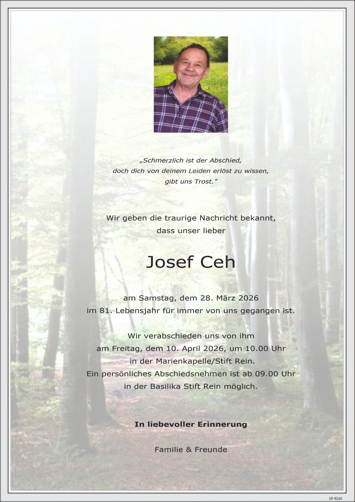 Trauerfeier am 10. April 2026 um 10:00 Uhr,