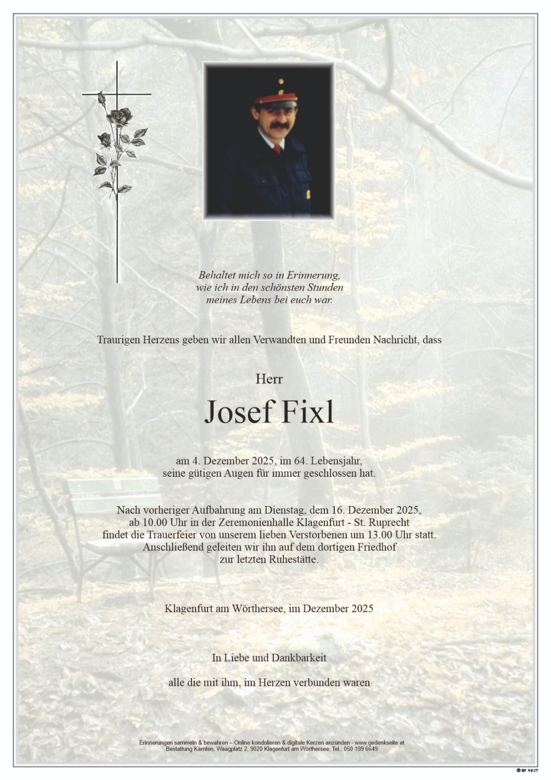 Verschicken Sie eine private Nachricht an die Familie & Hinterbliebenen von Josef Fixl. Diese wird nicht veröffentlicht, sondern landet direkt im E-Mail-Postfach der Administrator:innen dieser persönlichen Gedenkseite.