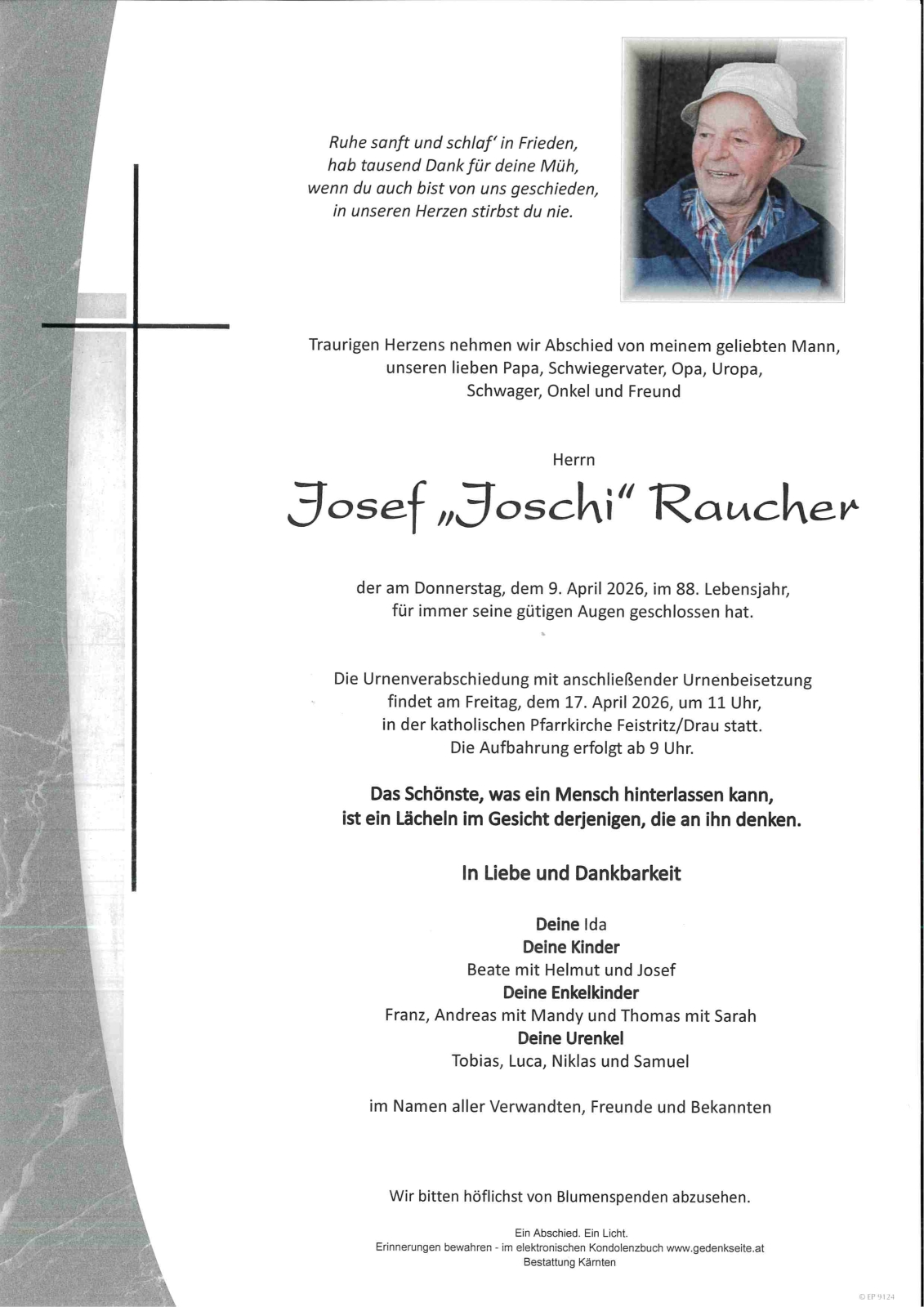 Verschicken Sie eine private Nachricht an die Familie & Hinterbliebenen von Josef "Joschi" Raucher. Diese wird nicht veröffentlicht, sondern landet direkt im E-Mail-Postfach der Administrator:innen dieser persönlichen Gedenkseite.