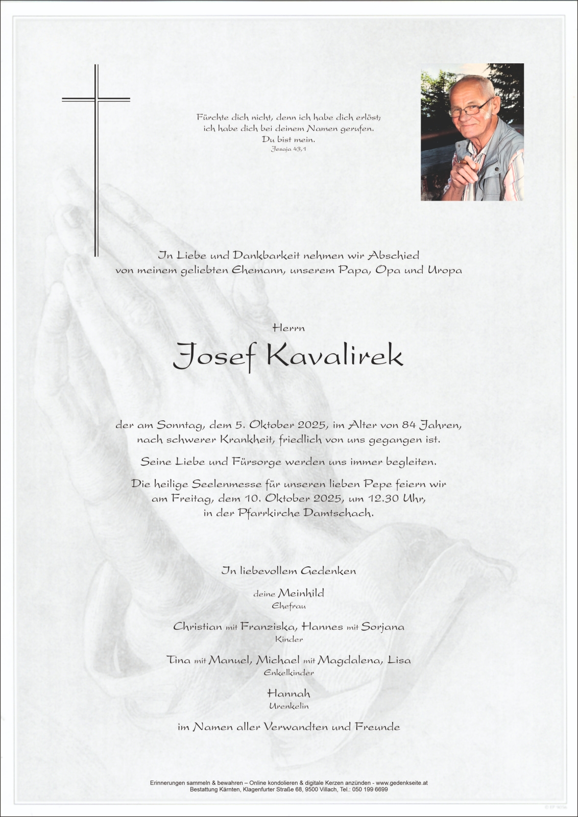 Verschicken Sie eine private Nachricht an die Familie & Hinterbliebenen von Josef Kavalirek. Diese wird nicht veröffentlicht, sondern landet direkt im E-Mail-Postfach der Administrator:innen dieser persönlichen Gedenkseite.