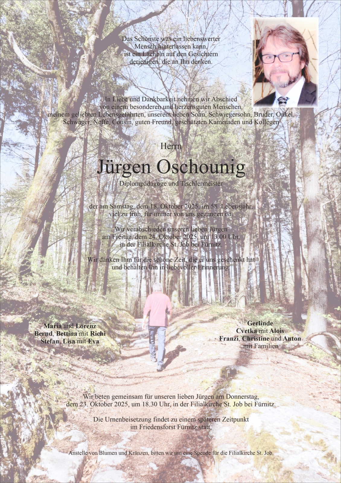 Verschicken Sie eine private Nachricht an die Familie & Hinterbliebenen von Jürgen Oschounig. Diese wird nicht veröffentlicht, sondern landet direkt im E-Mail-Postfach der Administrator:innen dieser persönlichen Gedenkseite.