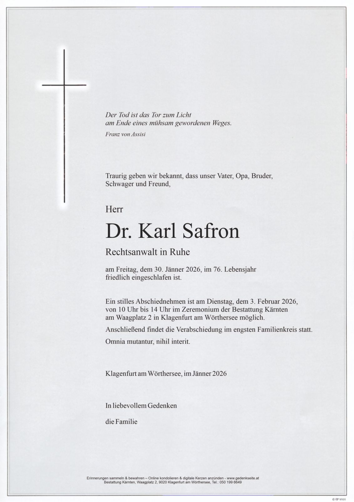 Verschicken Sie eine private Nachricht an die Familie & Hinterbliebenen von Karl Safron. Diese wird nicht veröffentlicht, sondern landet direkt im E-Mail-Postfach der Administrator:innen dieser persönlichen Gedenkseite.
