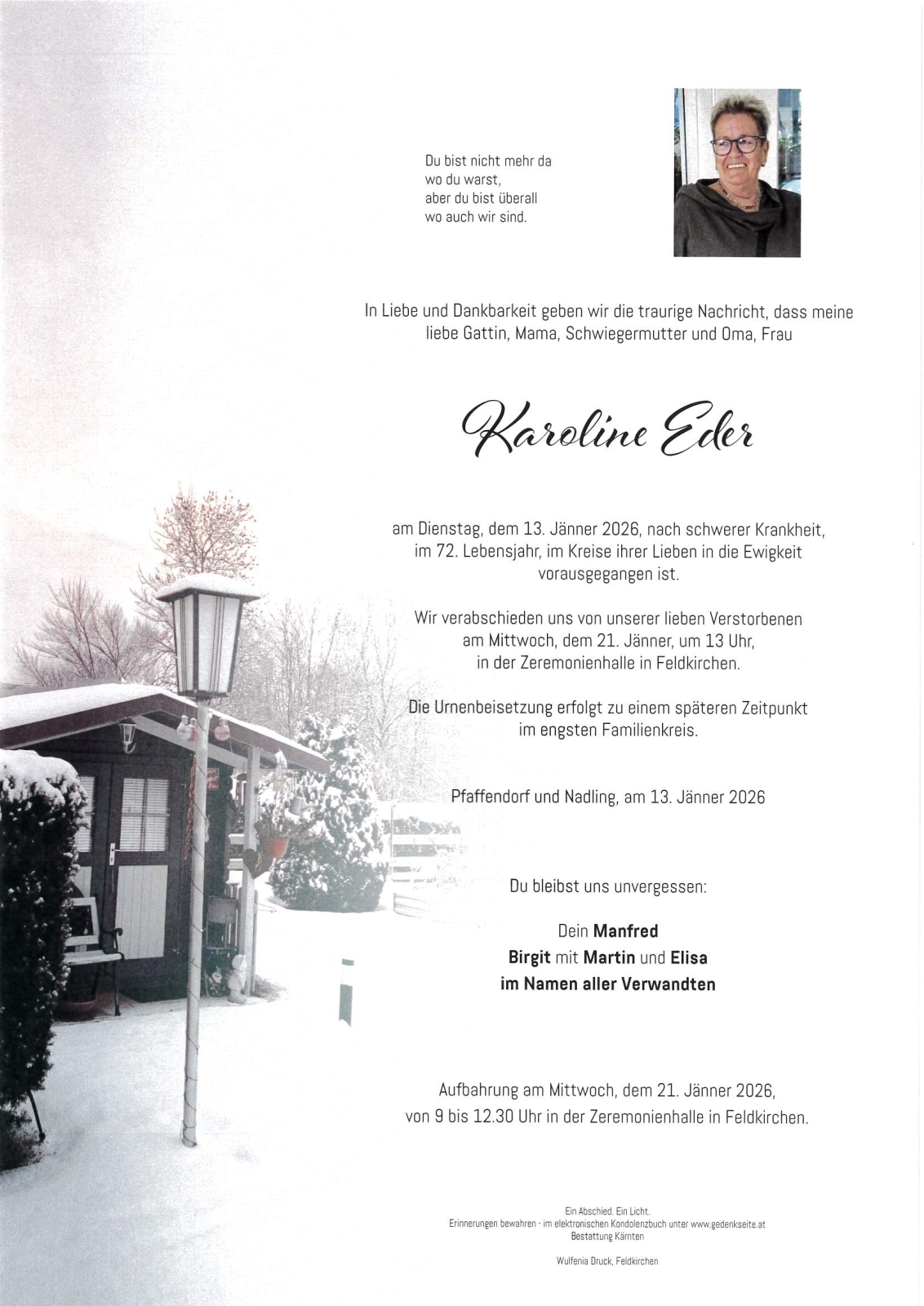Verschicken Sie eine private Nachricht an die Familie & Hinterbliebenen von Karoline Eder. Diese wird nicht veröffentlicht, sondern landet direkt im E-Mail-Postfach der Administrator:innen dieser persönlichen Gedenkseite.