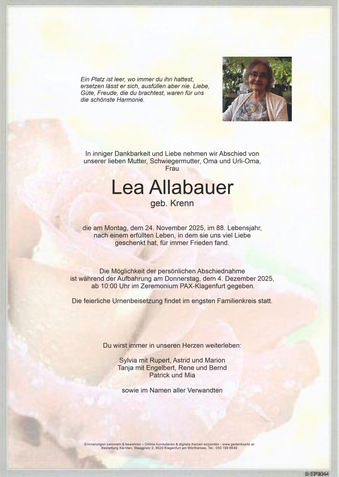 Verschicken Sie eine private Nachricht an die Familie & Hinterbliebenen von Lea Allabauer. Diese wird nicht veröffentlicht, sondern landet direkt im E-Mail-Postfach der Administrator:innen dieser persönlichen Gedenkseite.