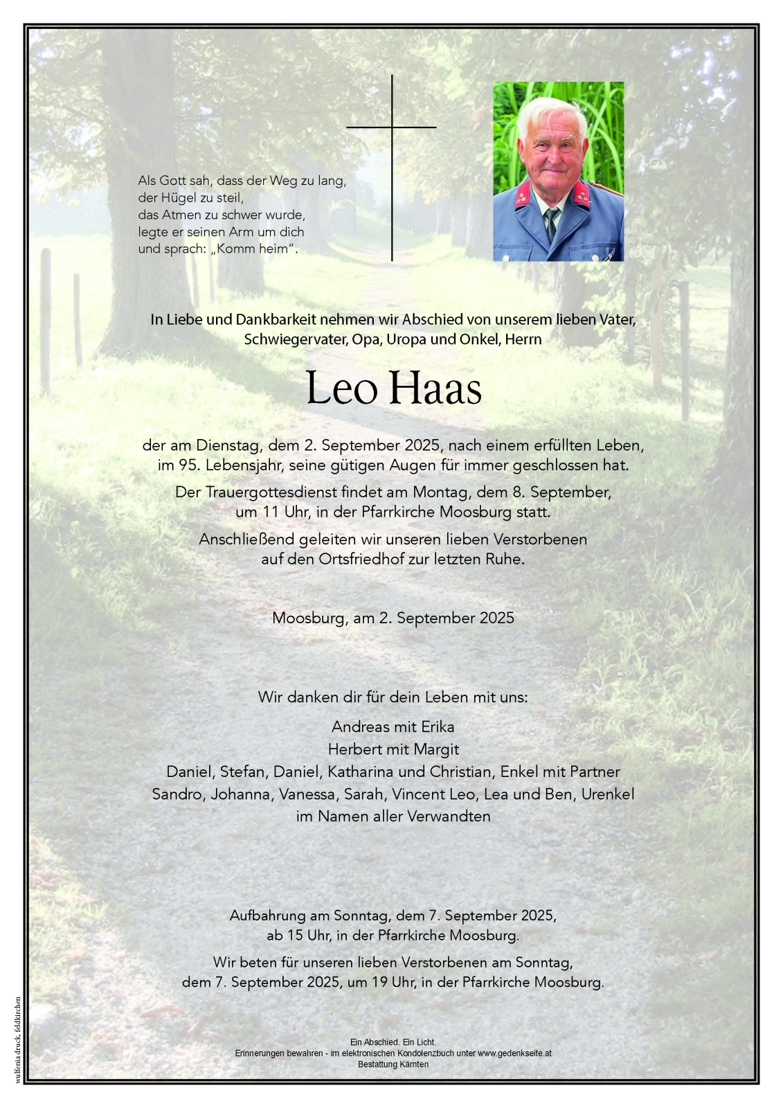 Verschicken Sie eine private Nachricht an die Familie & Hinterbliebenen von Leo Haas. Diese wird nicht veröffentlicht, sondern landet direkt im E-Mail-Postfach der Administrator:innen dieser persönlichen Gedenkseite.