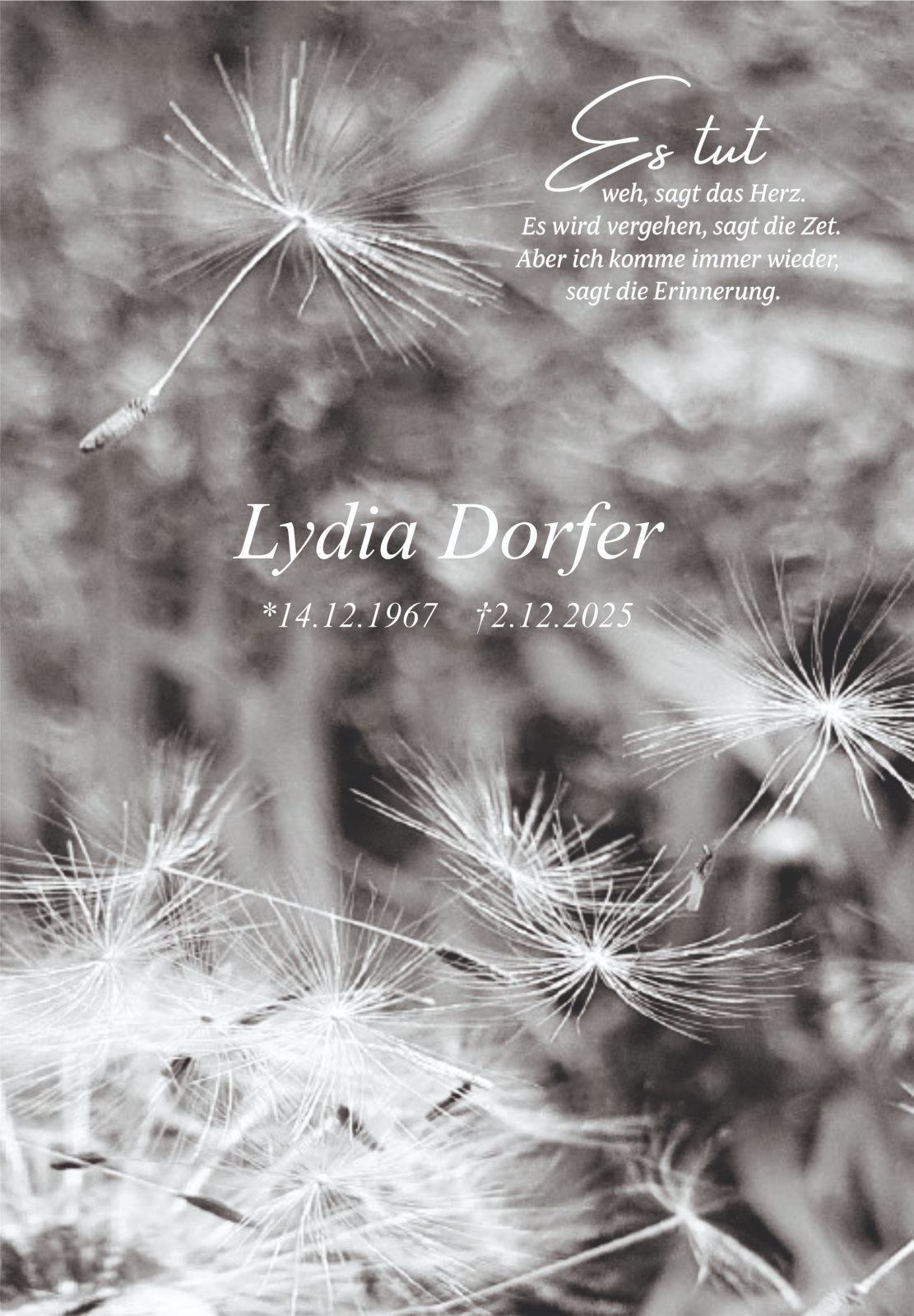 Verschicken Sie eine private Nachricht an die Familie & Hinterbliebenen von Lydia Dorfer. Diese wird nicht veröffentlicht, sondern landet direkt im E-Mail-Postfach der Administrator:innen dieser persönlichen Gedenkseite.
