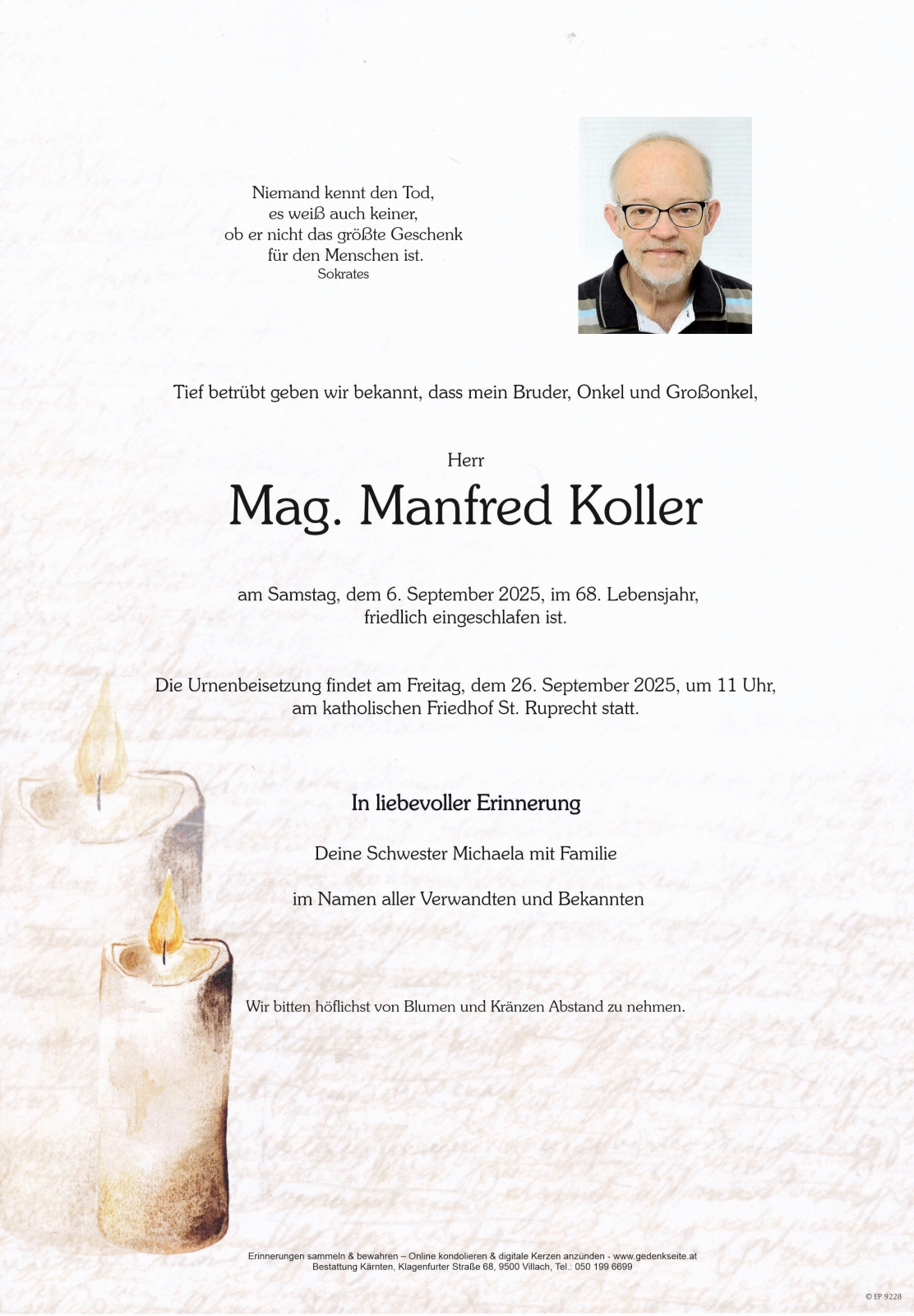 Verschicken Sie eine private Nachricht an die Familie & Hinterbliebenen von Mag. Manfred Koller. Diese wird nicht veröffentlicht, sondern landet direkt im E-Mail-Postfach der Administrator:innen dieser persönlichen Gedenkseite.