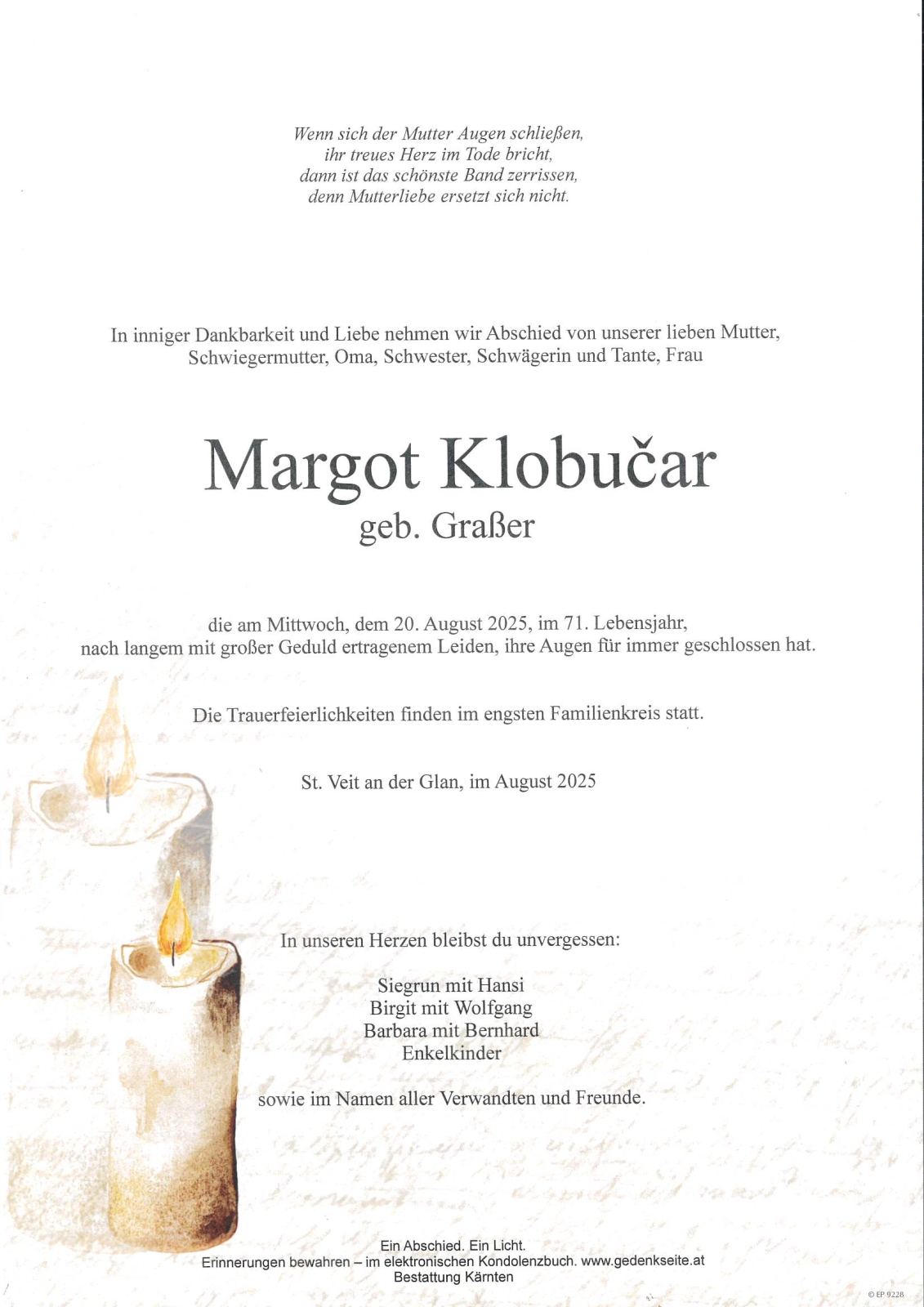 Verschicken Sie eine private Nachricht an die Familie & Hinterbliebenen von Margot Klobučar. Diese wird nicht veröffentlicht, sondern landet direkt im E-Mail-Postfach der Administrator:innen dieser persönlichen Gedenkseite.