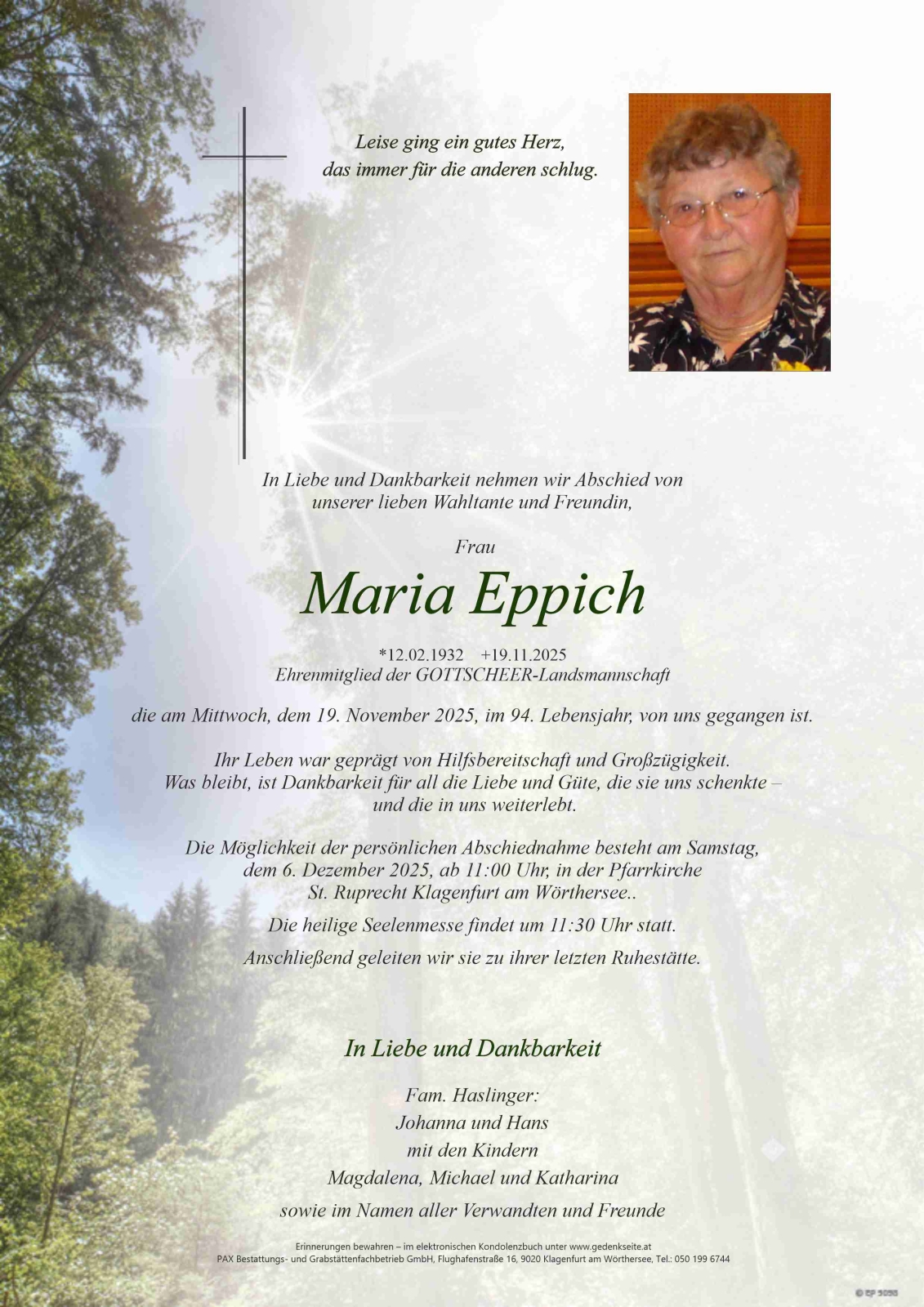 Trauerfeier am 6. Dezember 2025 um 11:30 Uhr,