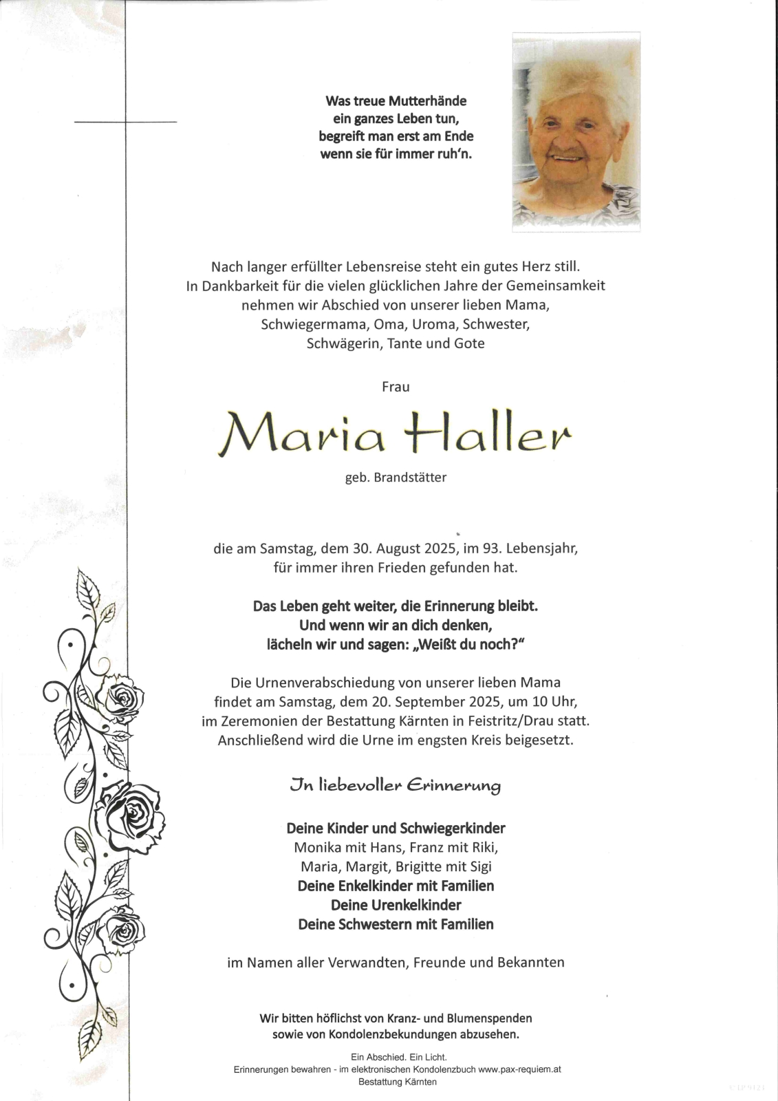 Verschicken Sie eine private Nachricht an die Familie & Hinterbliebenen von Maria Haller. Diese wird nicht veröffentlicht, sondern landet direkt im E-Mail-Postfach der Administrator:innen dieser persönlichen Gedenkseite.
