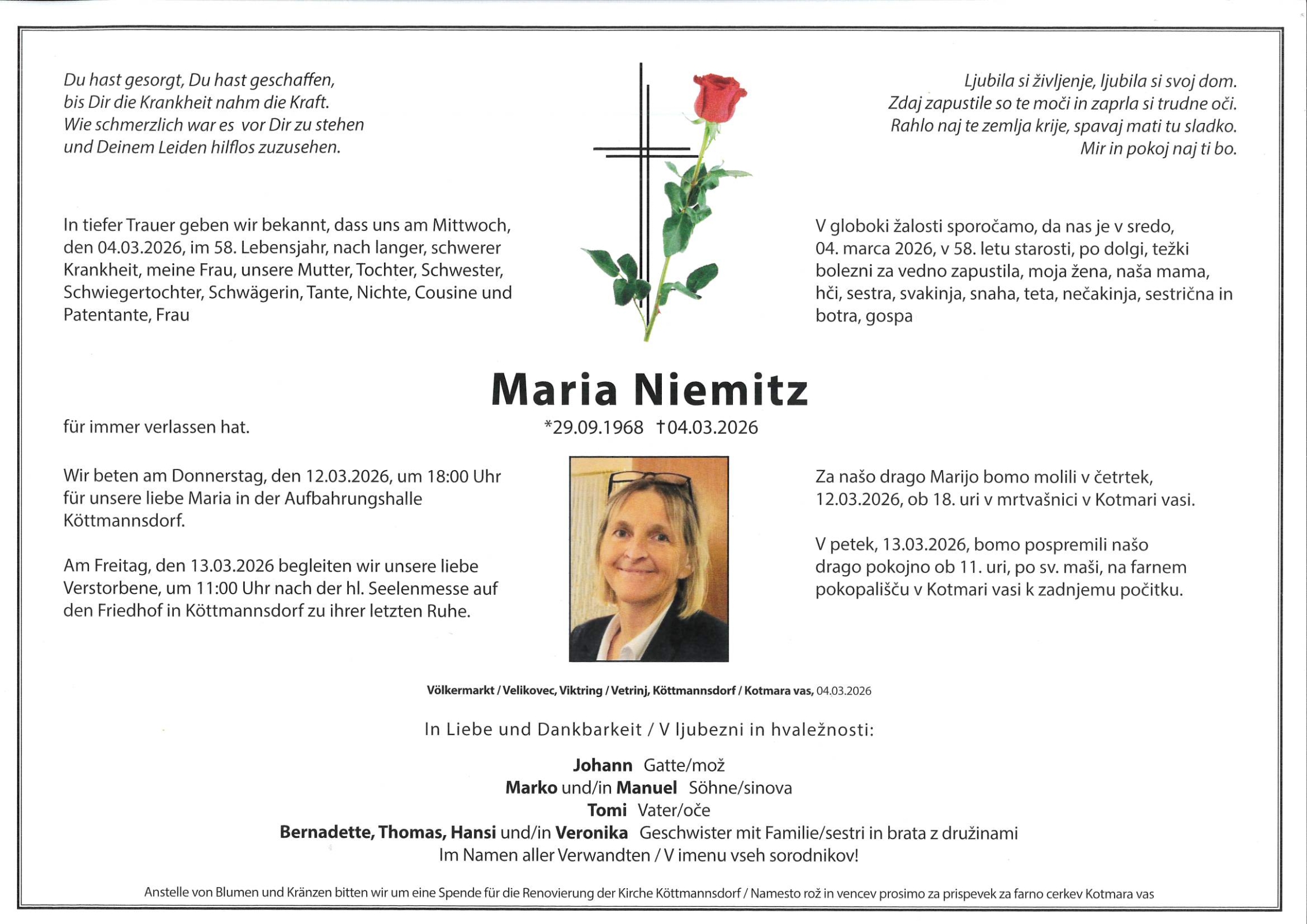 Verschicken Sie eine private Nachricht an die Familie & Hinterbliebenen von Maria Niemitz. Diese wird nicht veröffentlicht, sondern landet direkt im E-Mail-Postfach der Administrator:innen dieser persönlichen Gedenkseite.
