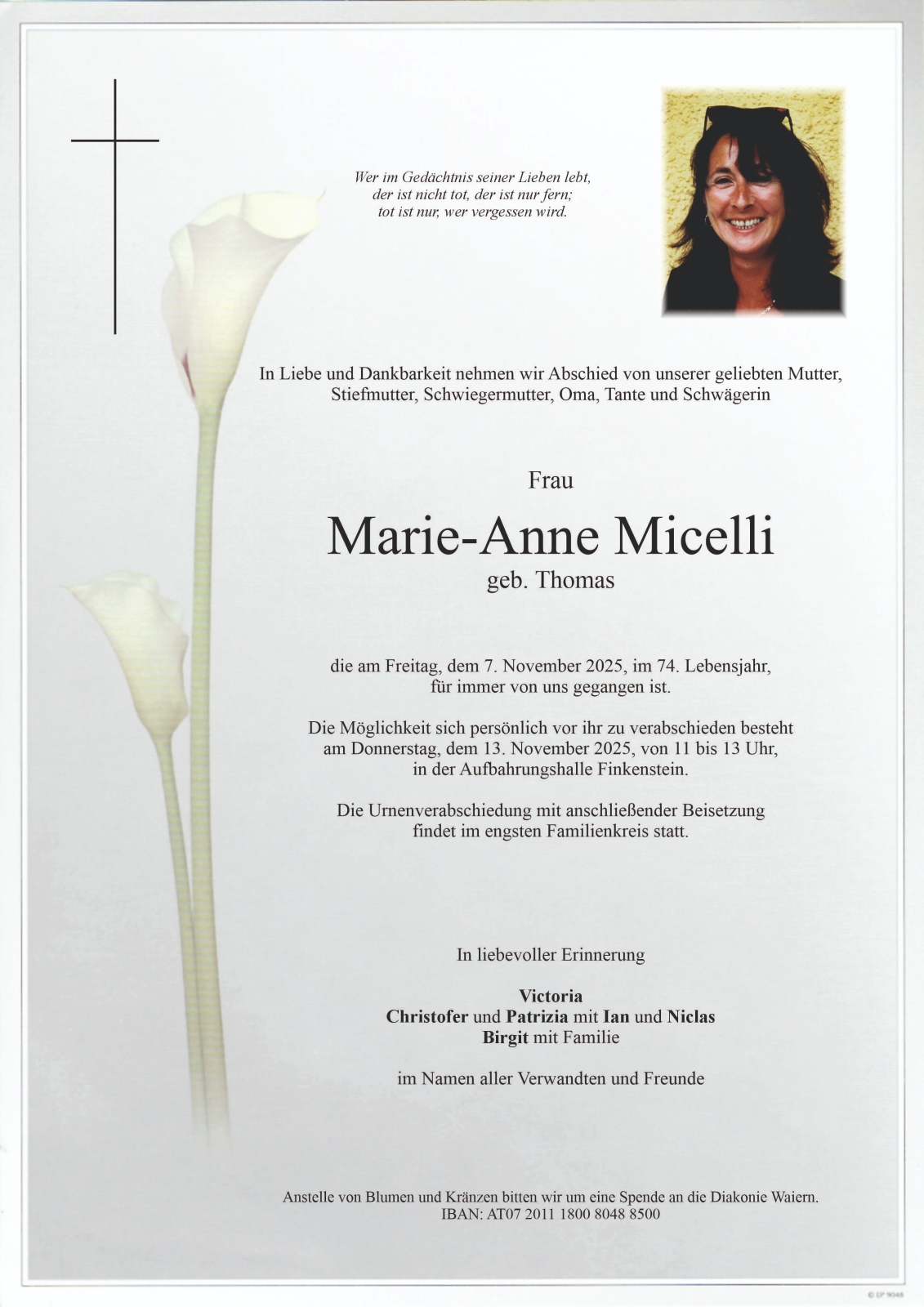 Verschicken Sie eine private Nachricht an die Familie & Hinterbliebenen von Marie-Anne Micelli. Diese wird nicht veröffentlicht, sondern landet direkt im E-Mail-Postfach der Administrator:innen dieser persönlichen Gedenkseite.