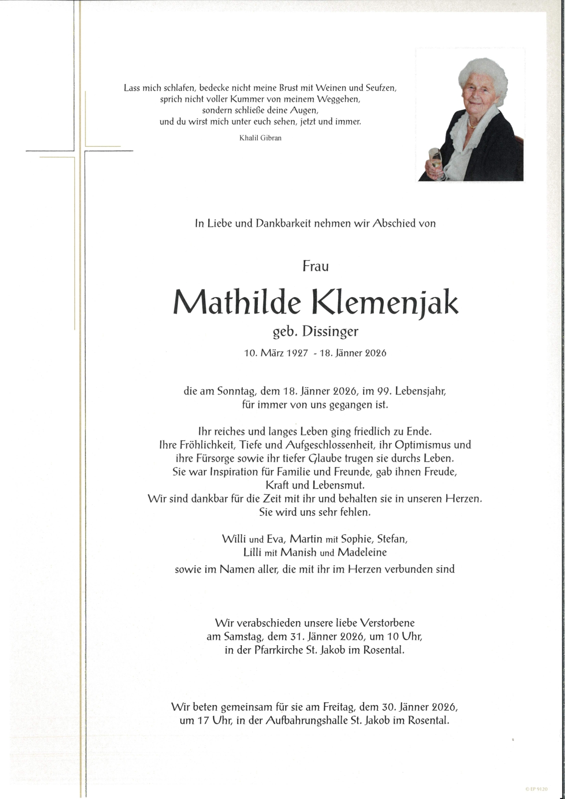 Verschicken Sie eine private Nachricht an die Familie & Hinterbliebenen von Mathilde Klemenjak. Diese wird nicht veröffentlicht, sondern landet direkt im E-Mail-Postfach der Administrator:innen dieser persönlichen Gedenkseite.