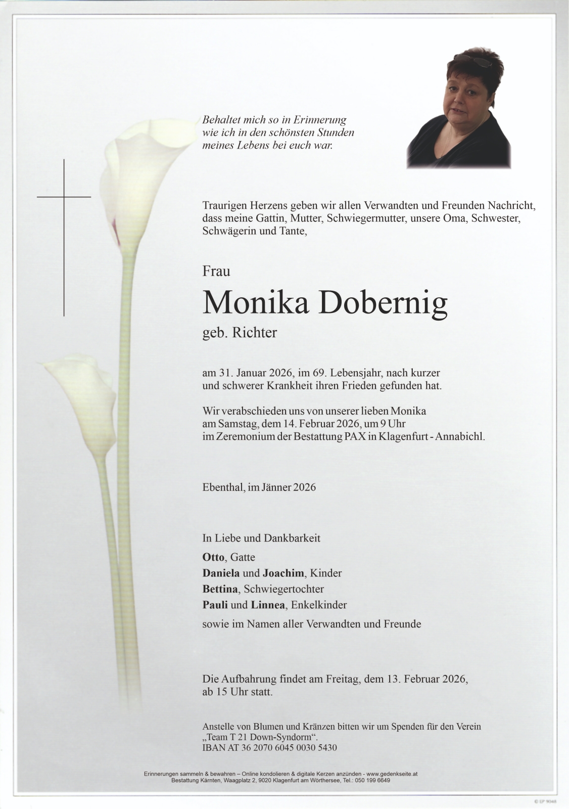 Verschicken Sie eine private Nachricht an die Familie & Hinterbliebenen von Monika Dobernig. Diese wird nicht veröffentlicht, sondern landet direkt im E-Mail-Postfach der Administrator:innen dieser persönlichen Gedenkseite.