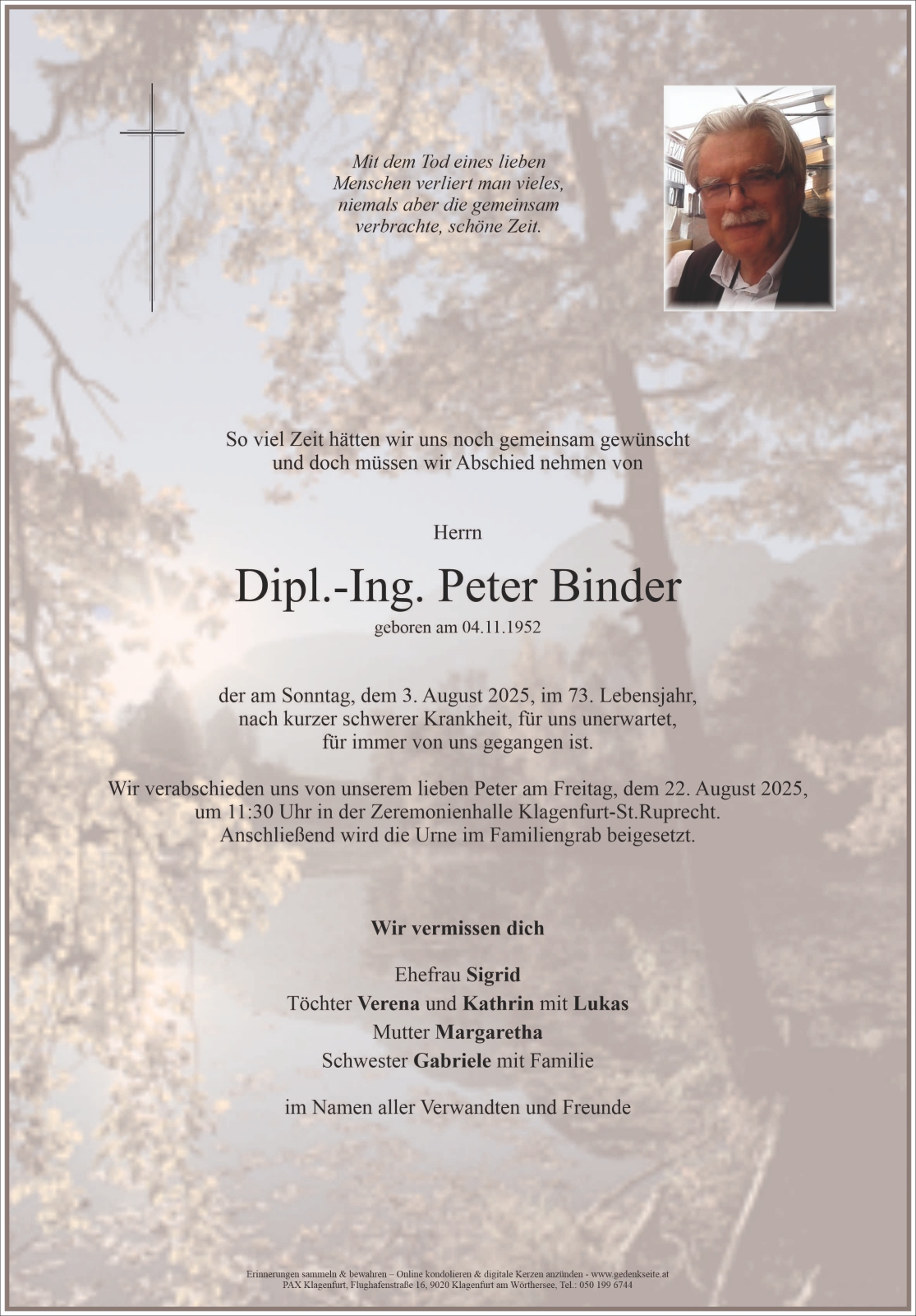 Verschicken Sie eine private Nachricht an die Familie & Hinterbliebenen von Peter Binder. Diese wird nicht veröffentlicht, sondern landet direkt im E-Mail-Postfach der Administrator:innen dieser persönlichen Gedenkseite.
