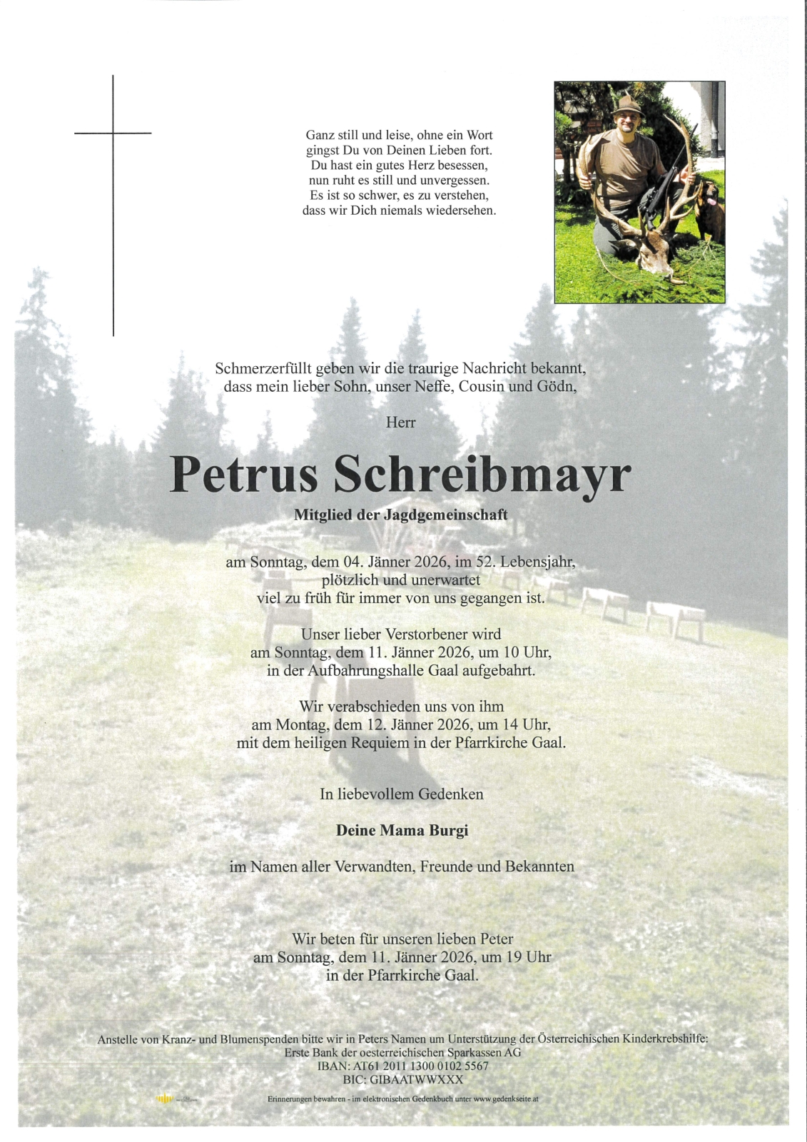 Verschicken Sie eine private Nachricht an die Familie & Hinterbliebenen von Petrus Schreibmayr. Diese wird nicht veröffentlicht, sondern landet direkt im E-Mail-Postfach der Administrator:innen dieser persönlichen Gedenkseite.