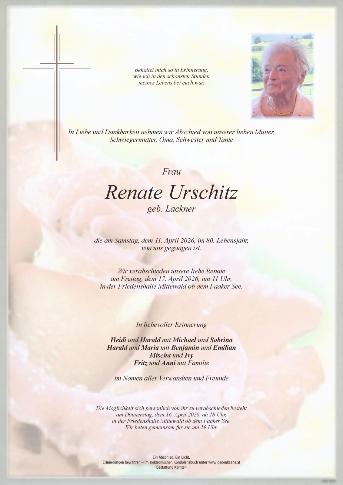 Trauerfeier am 17. April 2026 um 11:00 Uhr,