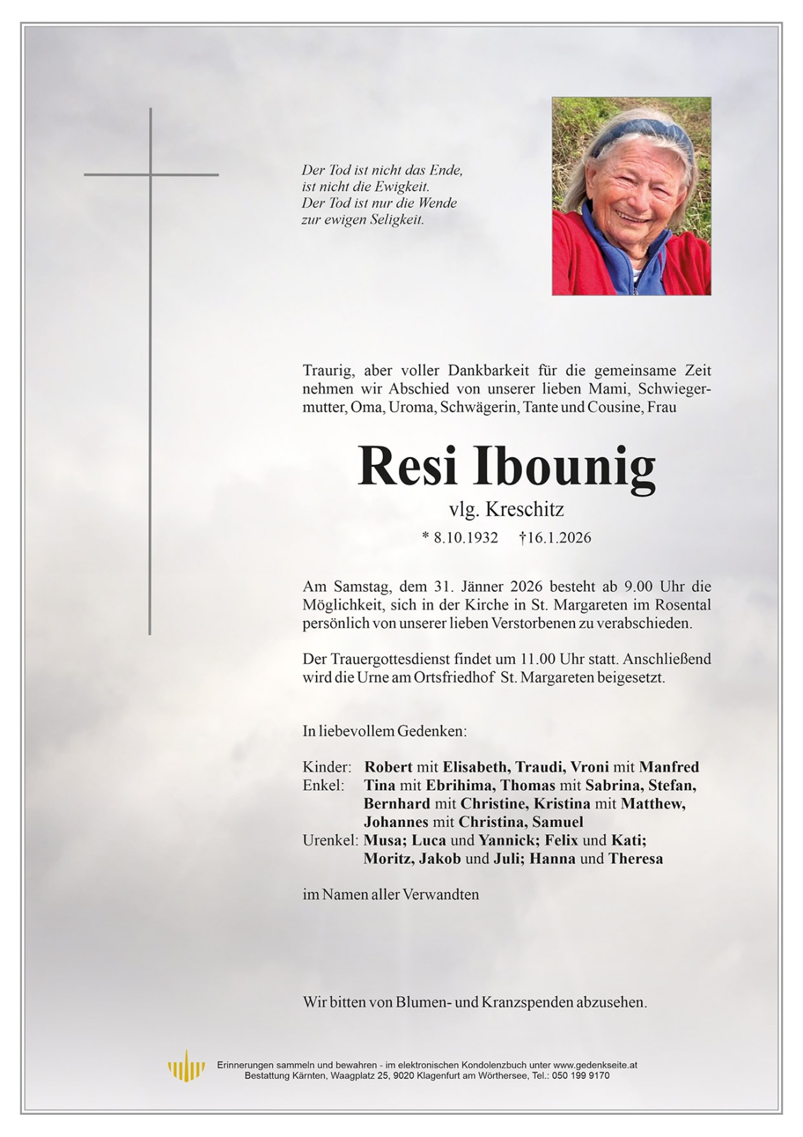 Verschicken Sie eine private Nachricht an die Familie & Hinterbliebenen von Resi Ibounig. Diese wird nicht veröffentlicht, sondern landet direkt im E-Mail-Postfach der Administrator:innen dieser persönlichen Gedenkseite.