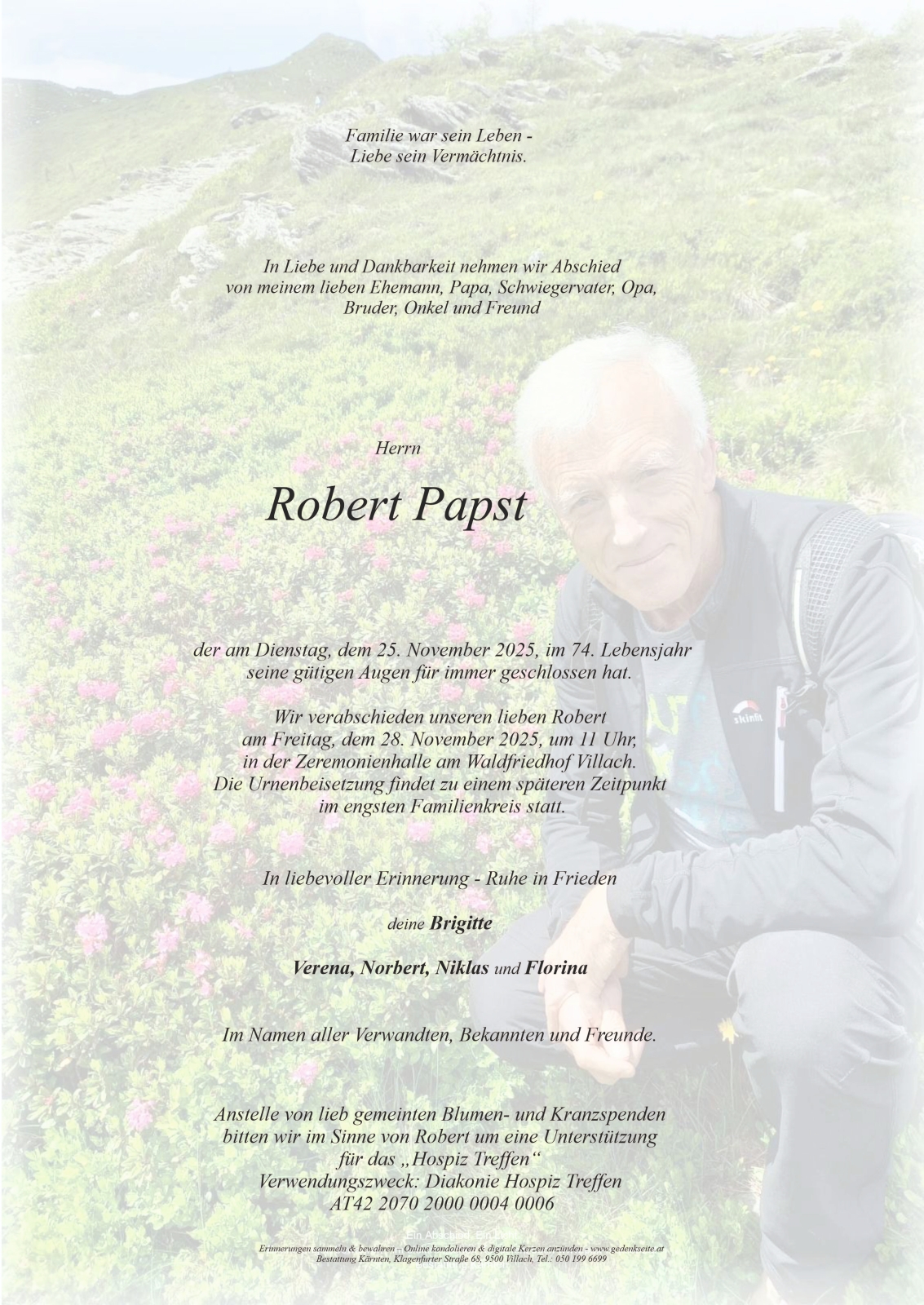 Verschicken Sie eine private Nachricht an die Familie & Hinterbliebenen von Robert Papst. Diese wird nicht veröffentlicht, sondern landet direkt im E-Mail-Postfach der Administrator:innen dieser persönlichen Gedenkseite.