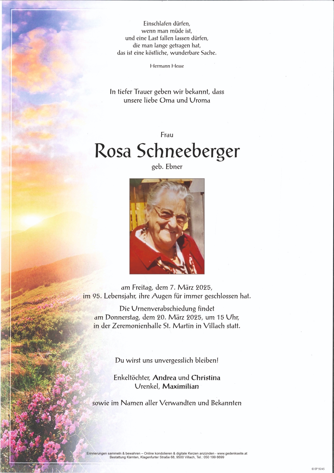 Verschicken Sie eine private Nachricht an die Familie & Hinterbliebenen von Rosa Schneeberger. Diese wird nicht veröffentlicht, sondern landet direkt im E-Mail-Postfach der Administrator:innen dieser persönlichen Gedenkseite.