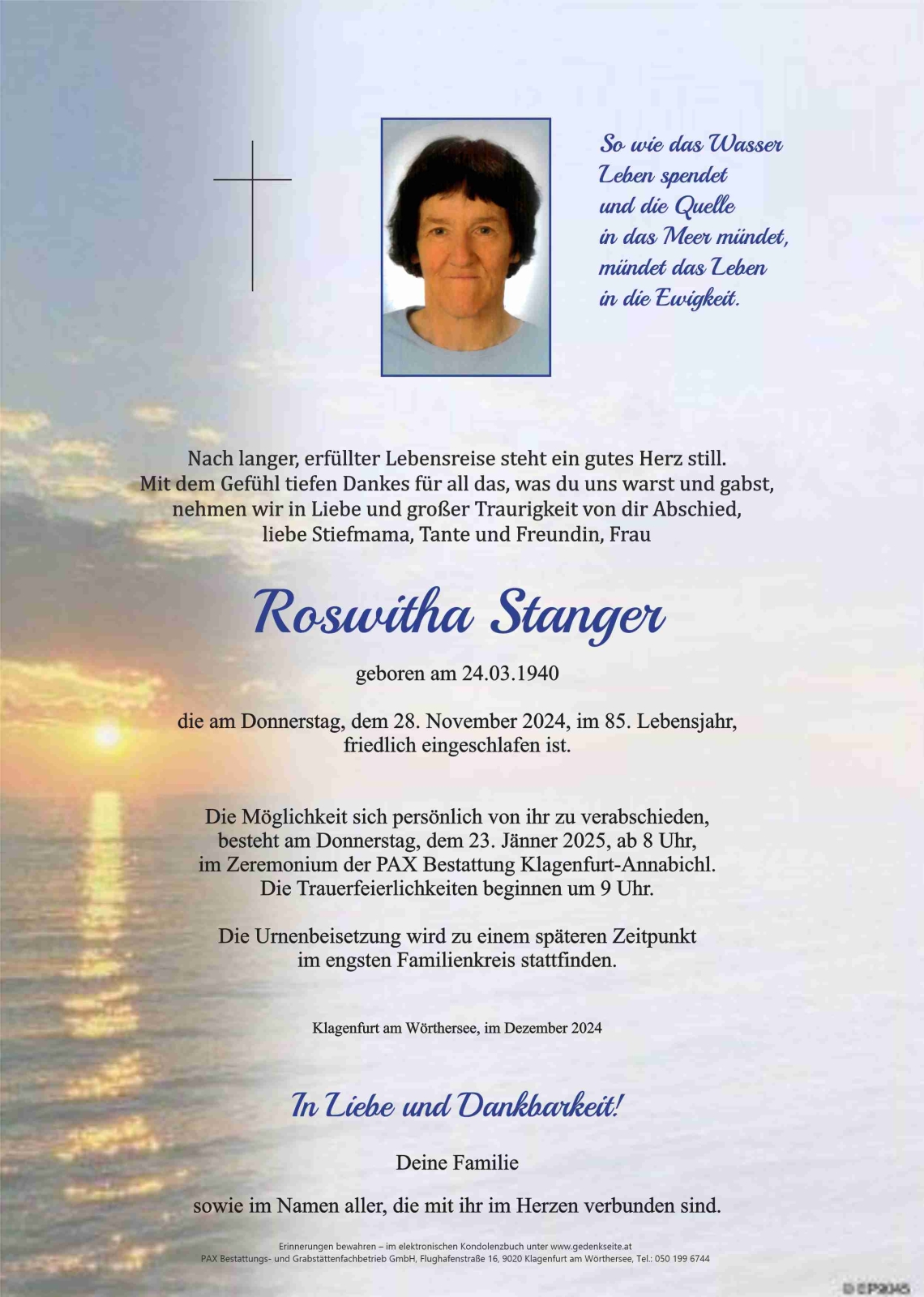 Verschicken Sie eine private Nachricht an die Familie & Hinterbliebenen von Roswitha Stanger. Diese wird nicht veröffentlicht, sondern landet direkt im E-Mail-Postfach der Administrator:innen dieser persönlichen Gedenkseite.