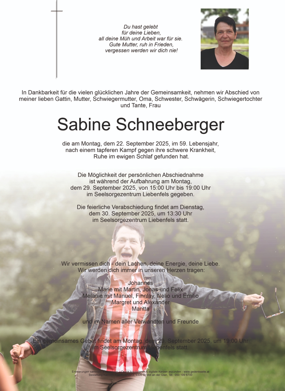 Verschicken Sie eine private Nachricht an die Familie & Hinterbliebenen von Sabine Schneeberger. Diese wird nicht veröffentlicht, sondern landet direkt im E-Mail-Postfach der Administrator:innen dieser persönlichen Gedenkseite.