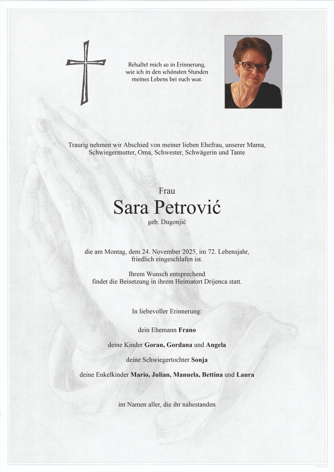 Verschicken Sie eine private Nachricht an die Familie & Hinterbliebenen von Sara Petrović. Diese wird nicht veröffentlicht, sondern landet direkt im E-Mail-Postfach der Administrator:innen dieser persönlichen Gedenkseite.
