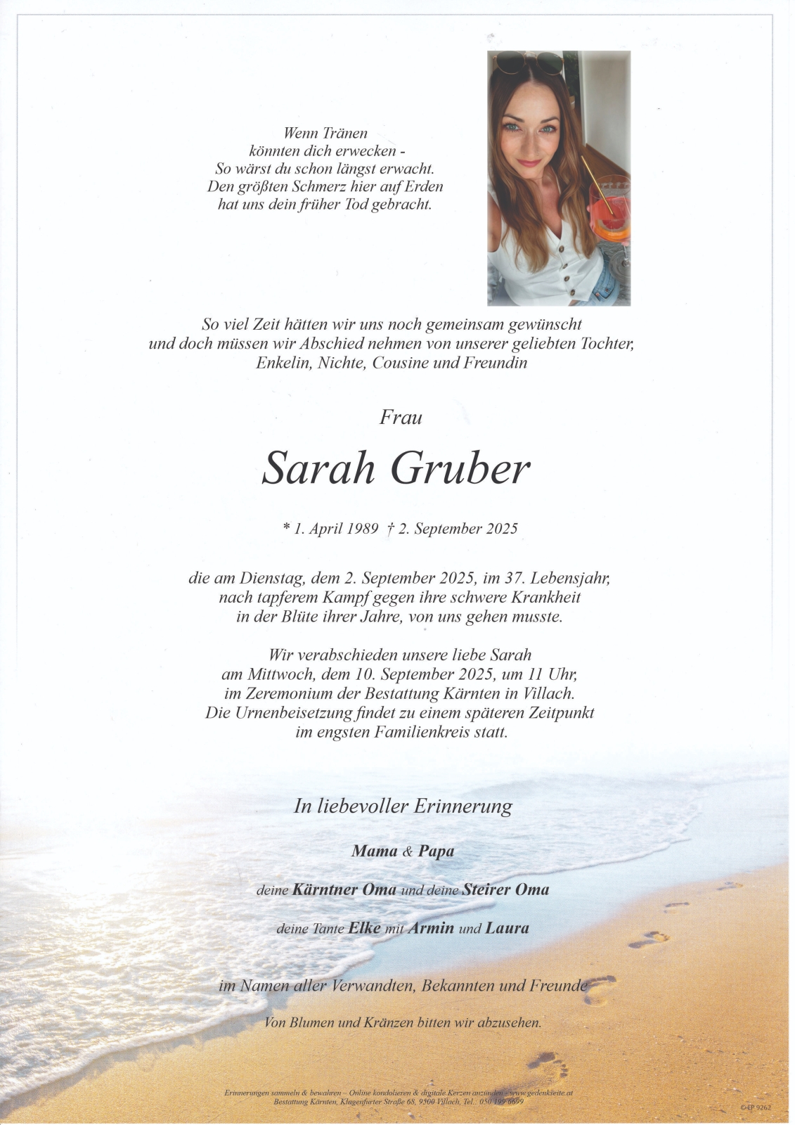 Verschicken Sie eine private Nachricht an die Familie & Hinterbliebenen von Sarah Gruber. Diese wird nicht veröffentlicht, sondern landet direkt im E-Mail-Postfach der Administrator:innen dieser persönlichen Gedenkseite.