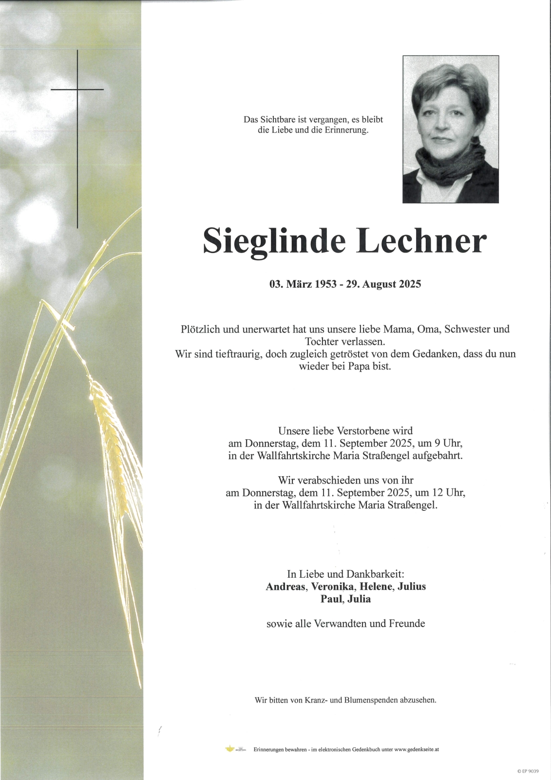 Verschicken Sie eine private Nachricht an die Familie & Hinterbliebenen von Sieglinde Lechner. Diese wird nicht veröffentlicht, sondern landet direkt im E-Mail-Postfach der Administrator:innen dieser persönlichen Gedenkseite.