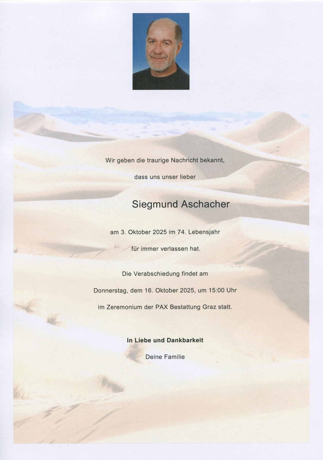 Verschicken Sie eine private Nachricht an die Familie & Hinterbliebenen von Siegmund Aschacher. Diese wird nicht veröffentlicht, sondern landet direkt im E-Mail-Postfach der Administrator:innen dieser persönlichen Gedenkseite.