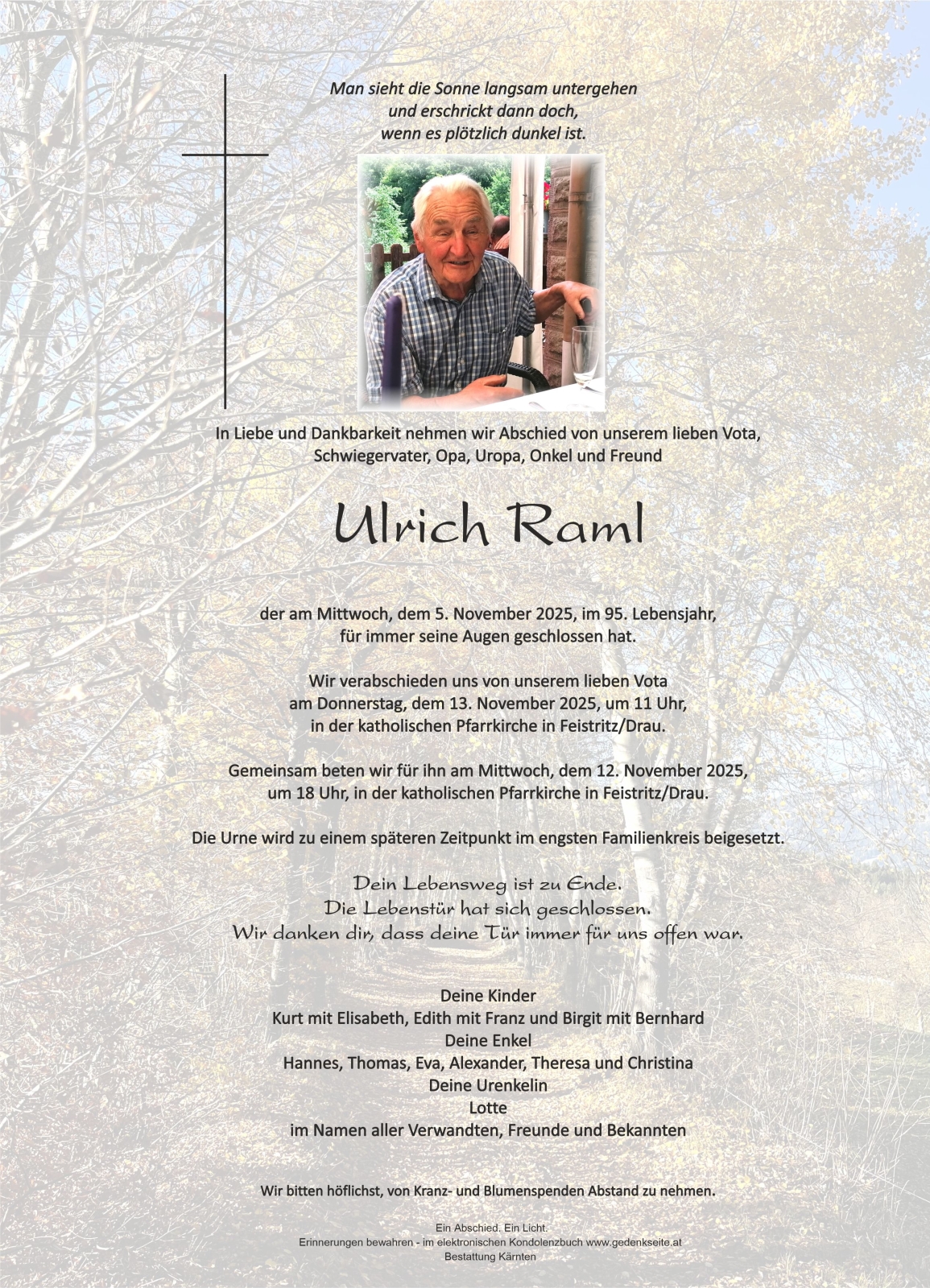Verschicken Sie eine private Nachricht an die Familie & Hinterbliebenen von Ulrich Raml. Diese wird nicht veröffentlicht, sondern landet direkt im E-Mail-Postfach der Administrator:innen dieser persönlichen Gedenkseite.
