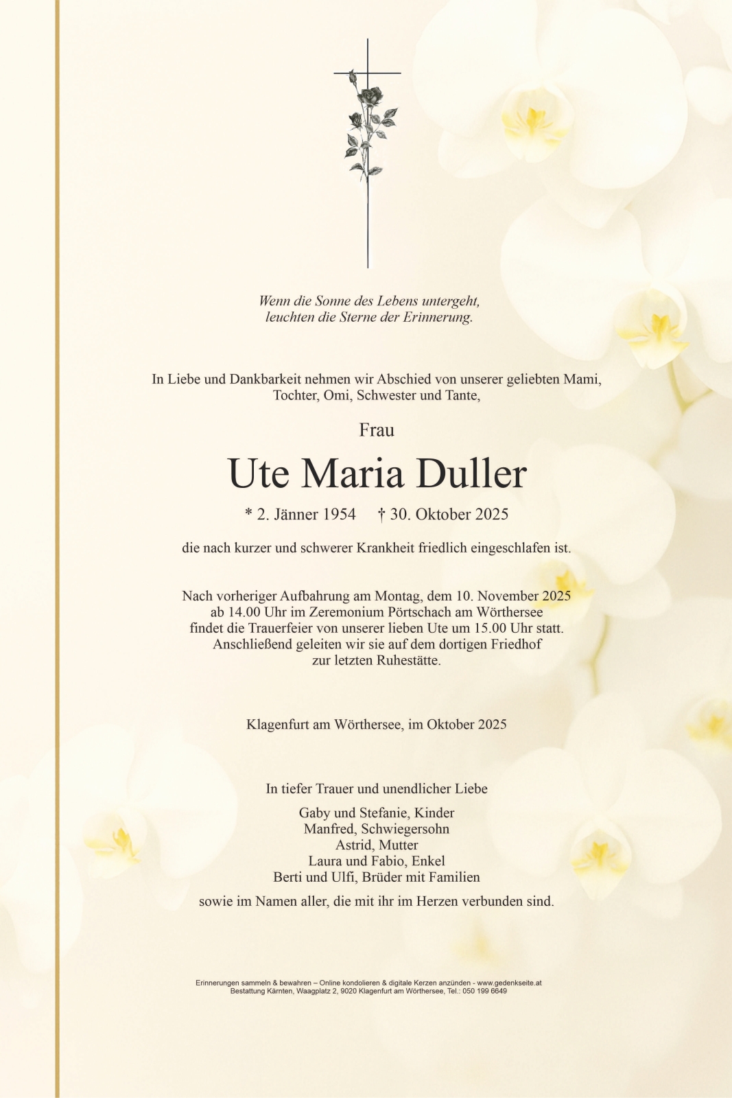 Verschicken Sie eine private Nachricht an die Familie & Hinterbliebenen von Ute Maria Duller. Diese wird nicht veröffentlicht, sondern landet direkt im E-Mail-Postfach der Administrator:innen dieser persönlichen Gedenkseite.