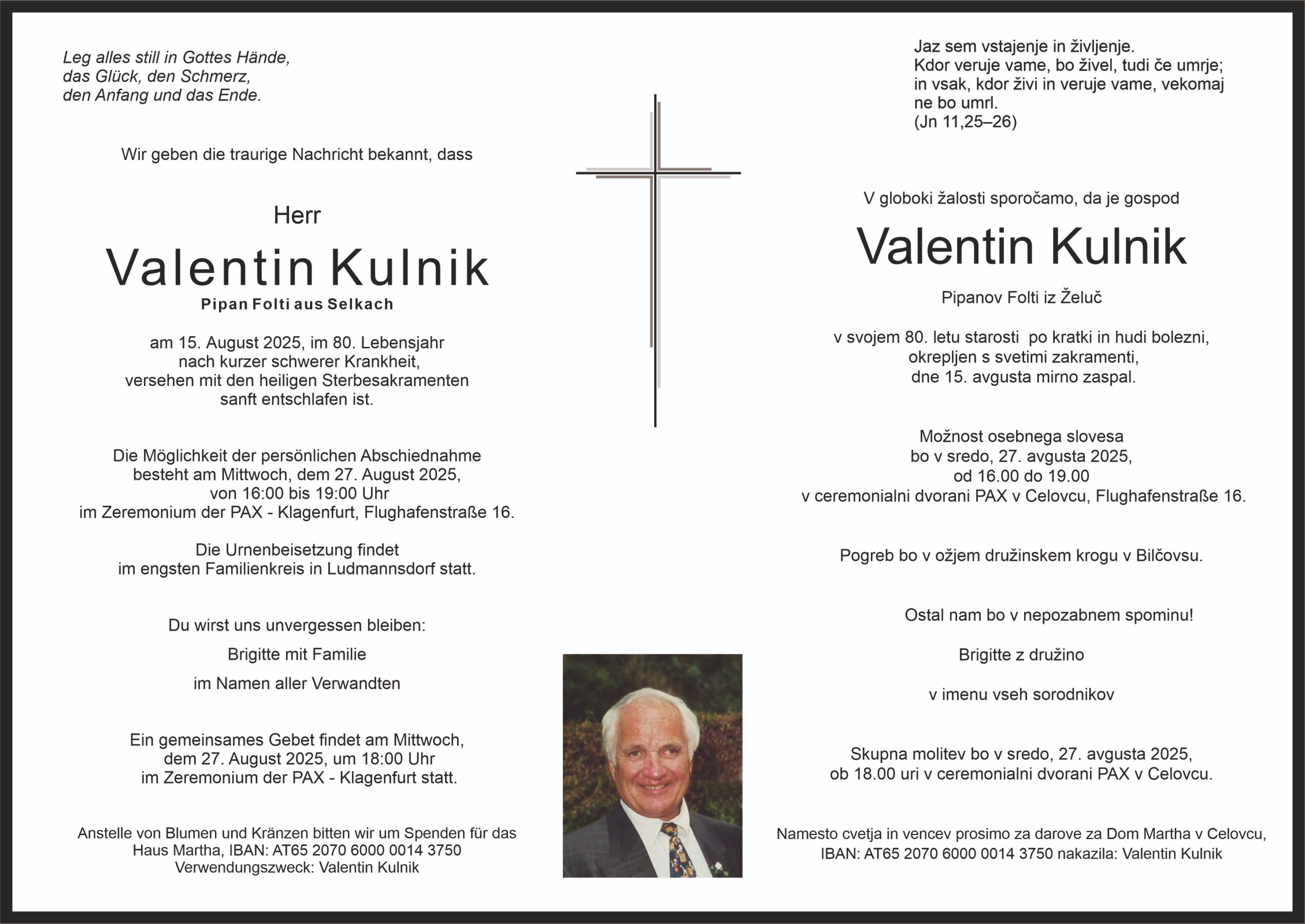 Verschicken Sie eine private Nachricht an die Familie & Hinterbliebenen von Valentin Kulnik. Diese wird nicht veröffentlicht, sondern landet direkt im E-Mail-Postfach der Administrator:innen dieser persönlichen Gedenkseite.