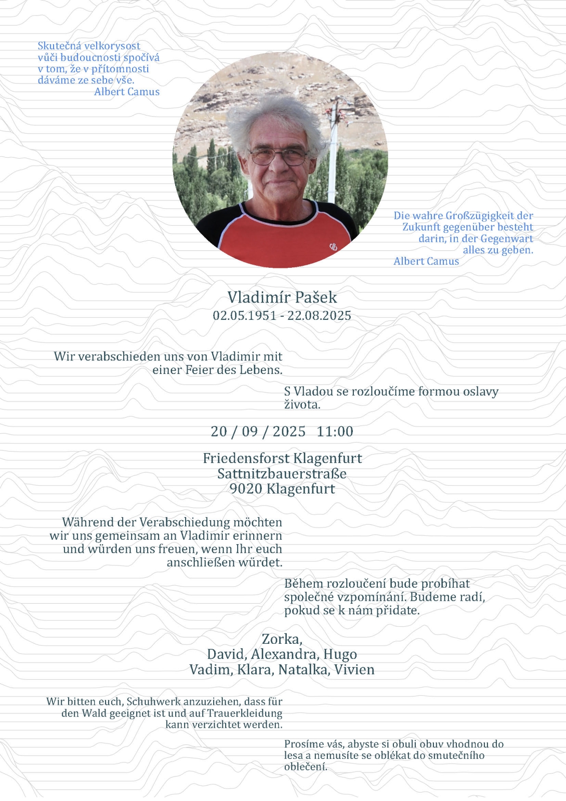 Verschicken Sie eine private Nachricht an die Familie & Hinterbliebenen von Vladimir Pasek. Diese wird nicht veröffentlicht, sondern landet direkt im E-Mail-Postfach der Administrator:innen dieser persönlichen Gedenkseite.
