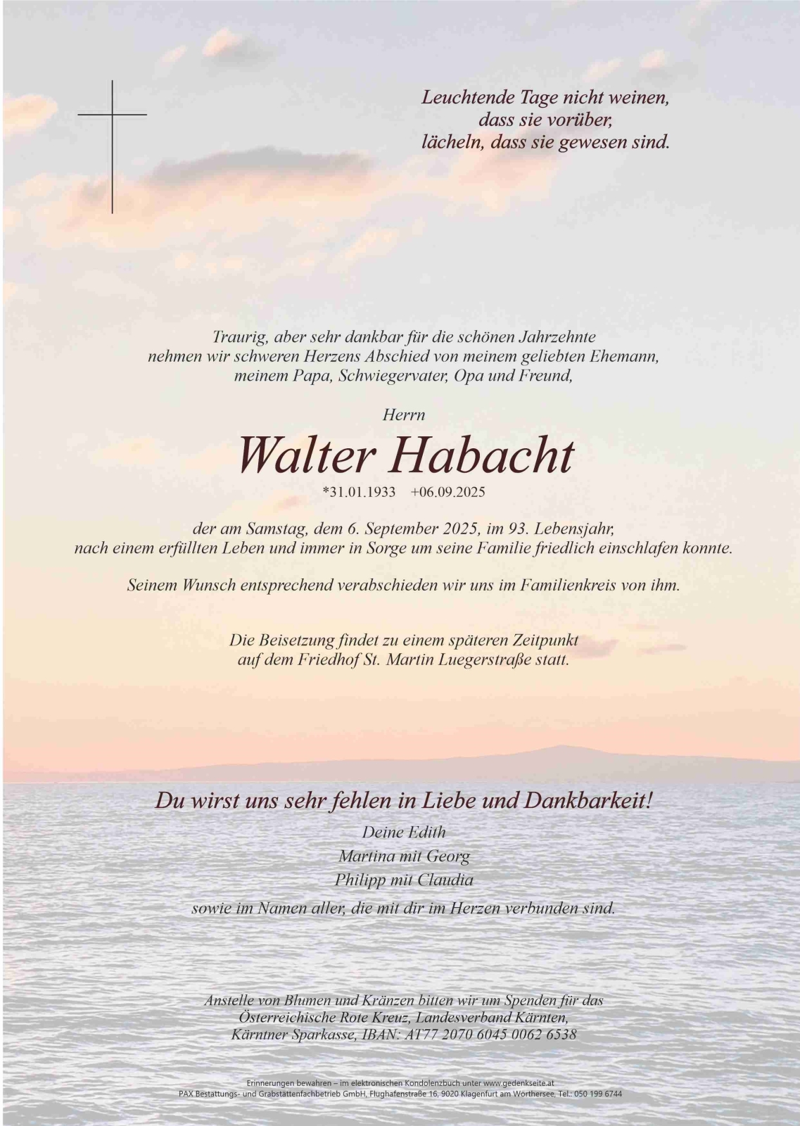 Verschicken Sie eine private Nachricht an die Familie & Hinterbliebenen von Walter Habacht. Diese wird nicht veröffentlicht, sondern landet direkt im E-Mail-Postfach der Administrator:innen dieser persönlichen Gedenkseite.