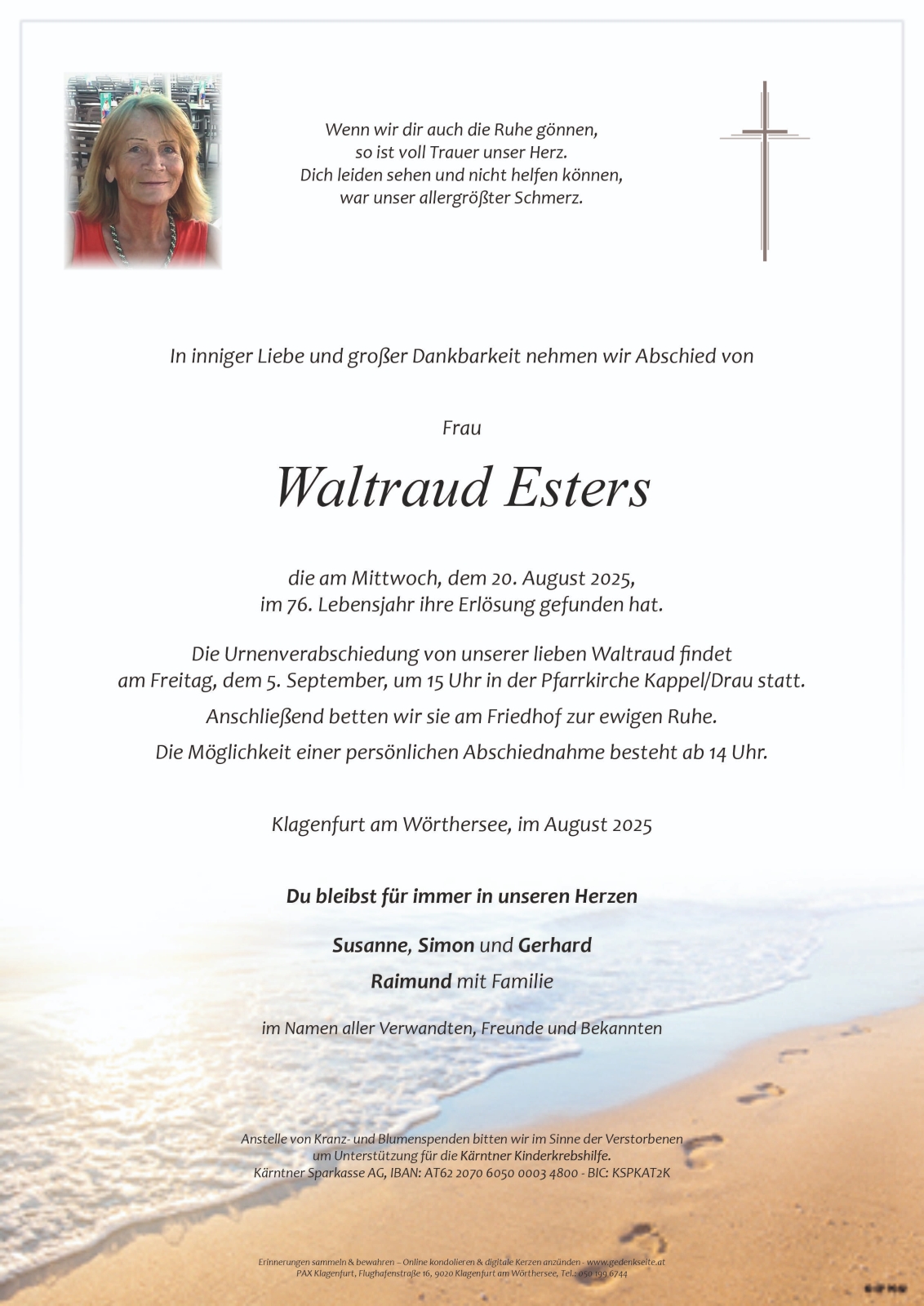 Verschicken Sie eine private Nachricht an die Familie & Hinterbliebenen von Waltraud Esters. Diese wird nicht veröffentlicht, sondern landet direkt im E-Mail-Postfach der Administrator:innen dieser persönlichen Gedenkseite.