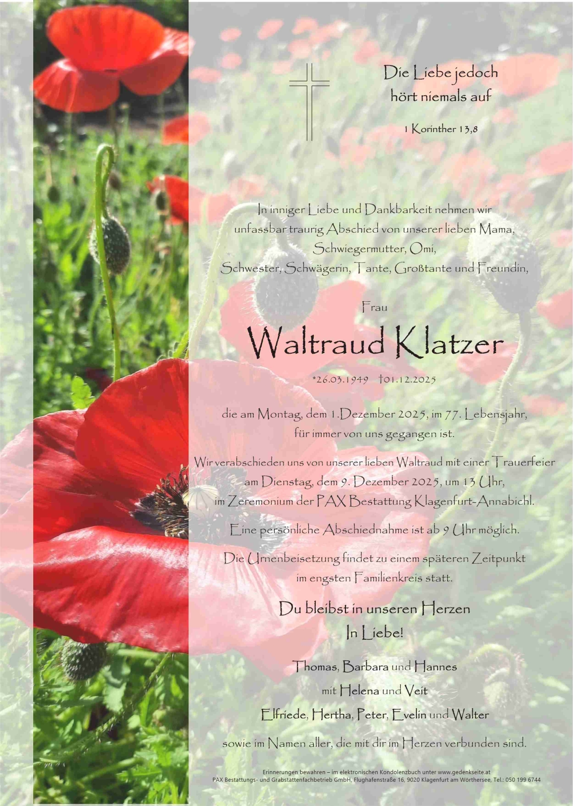 Verschicken Sie eine private Nachricht an die Familie & Hinterbliebenen von Waltraud Klatzer. Diese wird nicht veröffentlicht, sondern landet direkt im E-Mail-Postfach der Administrator:innen dieser persönlichen Gedenkseite.