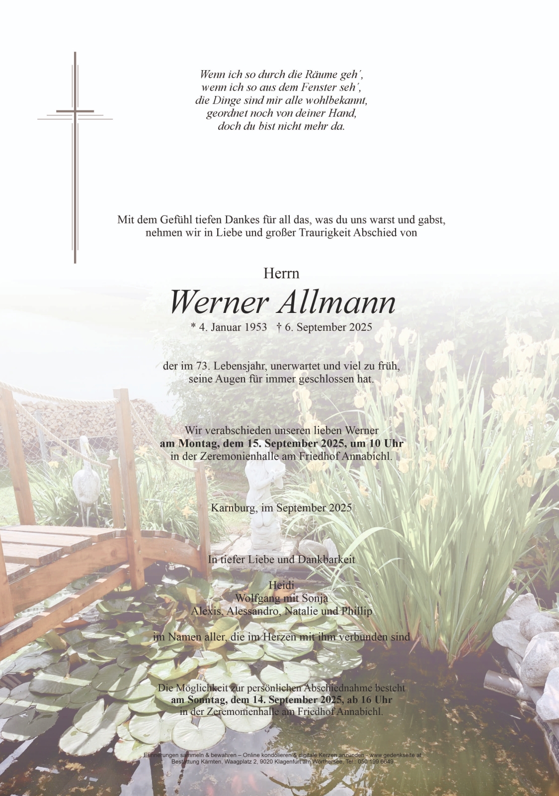 Verschicken Sie eine private Nachricht an die Familie & Hinterbliebenen von Werner Allmann. Diese wird nicht veröffentlicht, sondern landet direkt im E-Mail-Postfach der Administrator:innen dieser persönlichen Gedenkseite.