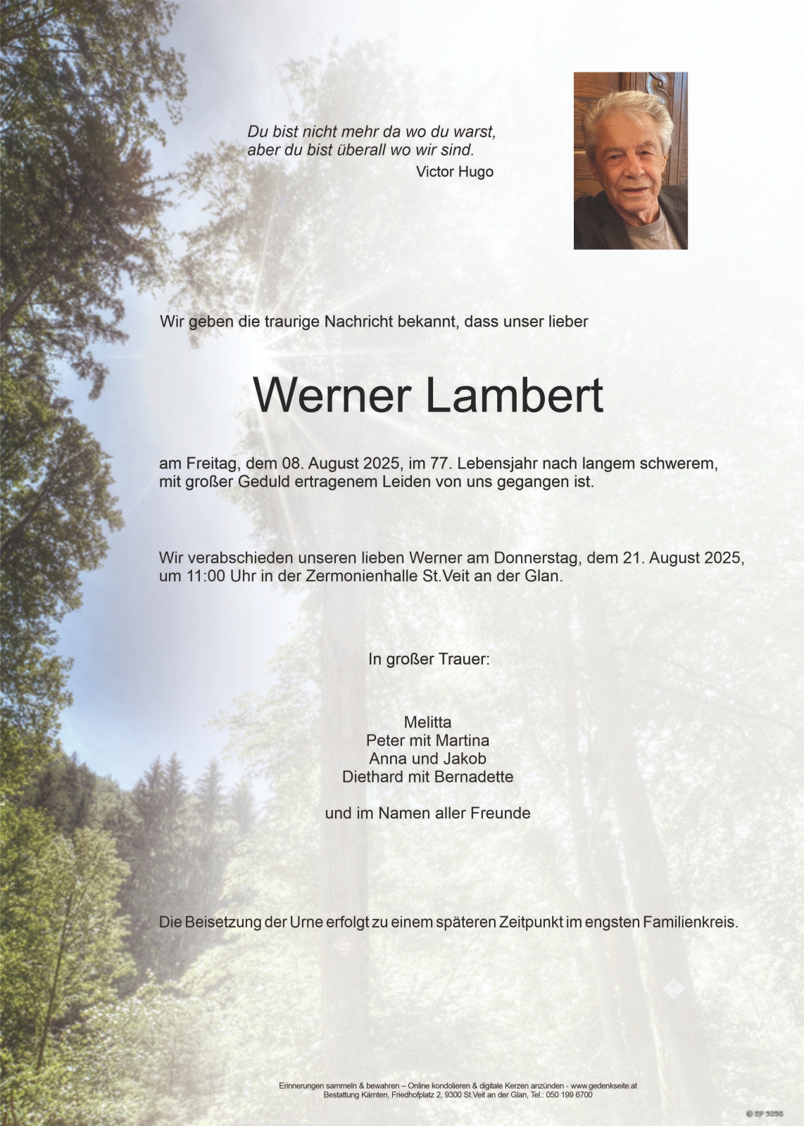 Verschicken Sie eine private Nachricht an die Familie & Hinterbliebenen von Werner Lambert. Diese wird nicht veröffentlicht, sondern landet direkt im E-Mail-Postfach der Administrator:innen dieser persönlichen Gedenkseite.
