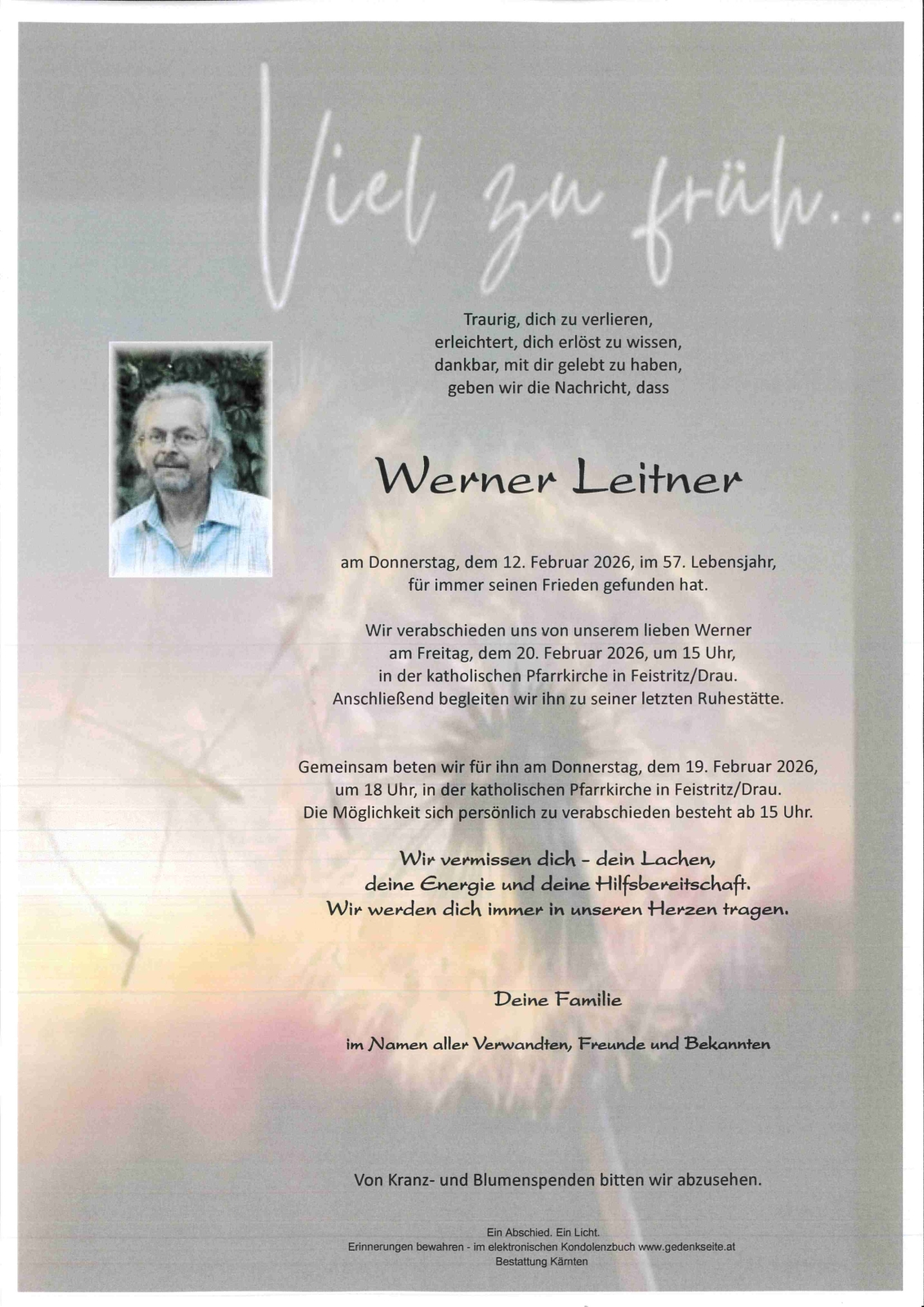 Verschicken Sie eine private Nachricht an die Familie & Hinterbliebenen von Werner Leitner. Diese wird nicht veröffentlicht, sondern landet direkt im E-Mail-Postfach der Administrator:innen dieser persönlichen Gedenkseite.